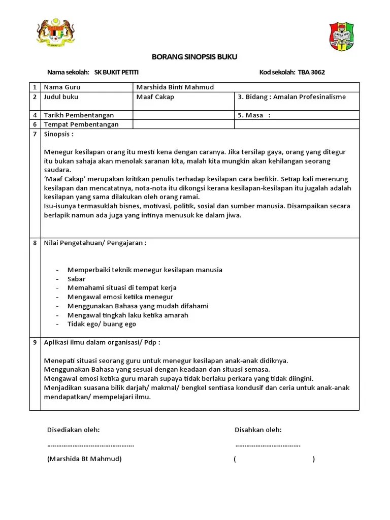 Nama guru hamka bin ramlan 2. Pembacaan buku sebagai tambahan bagi melengkapkan kursus ldp. Review) adalah bersamaan 1 hari kursus untuk guru tersebut. Lampiran c borang sinopsis buku nama sekolah :