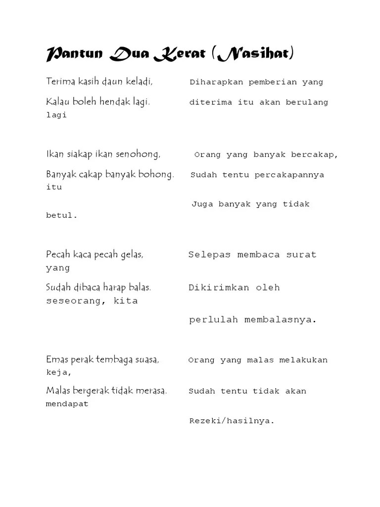 Teks dalam genre ini disusun sedemikian rupa untuk memudahkan murid mengenal pasti, menghayati dan seterusnya menimbulkan minat terhadap warisan budaya melayu yang. Pantun 2 kerat juga dikenali sebagai karmina, pantun kilat atau pantun dua serangkai. Pantun dapat dibahagikan kepada beberapa jenis bergantung pada jumlah kerat dan kandungannya. Teknik 01 pantun dua kerat (nasihat) puisi tradisional fokus proses bukan jawapan (faham itu penting) penyelenggara: